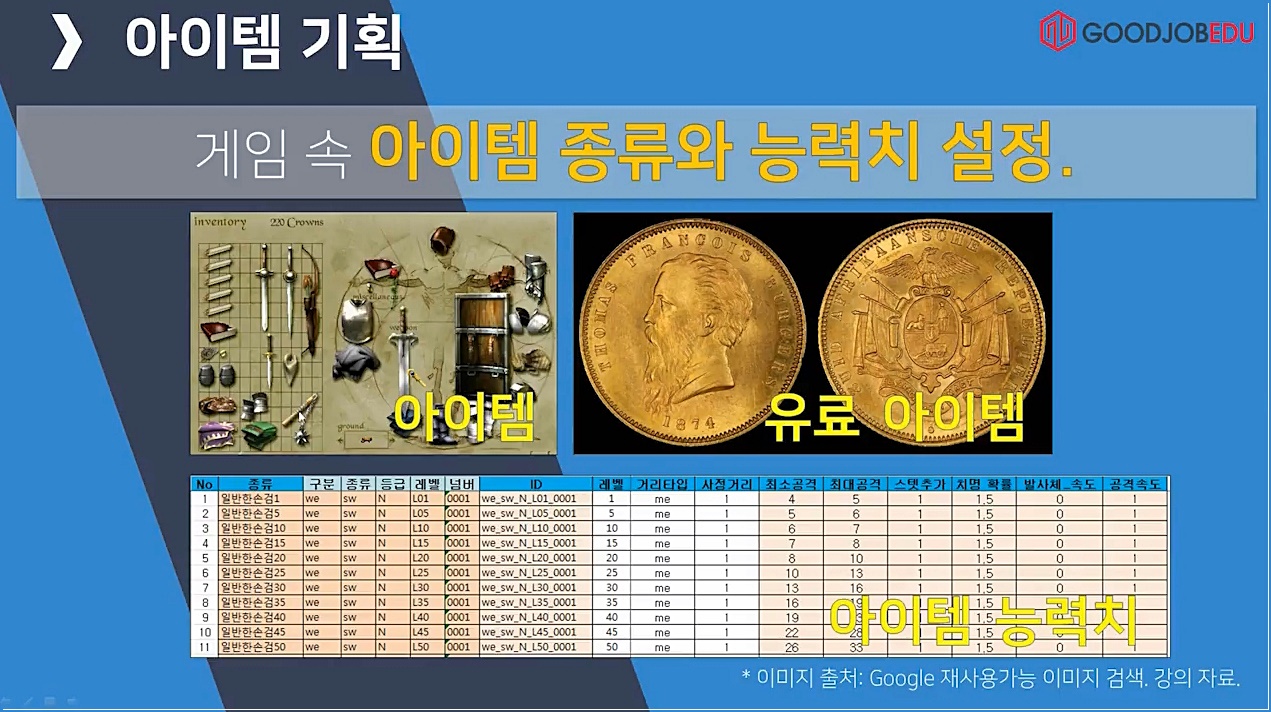 다음으로 아이템 기획. 게임을 하면서 아이템을 먹고 성장하면서 능력치가 향상되는 등 게임을 지속하게 하는 요소이다. 아이템을 비즈니스 모델로 하여 수익화 하기도 한다.