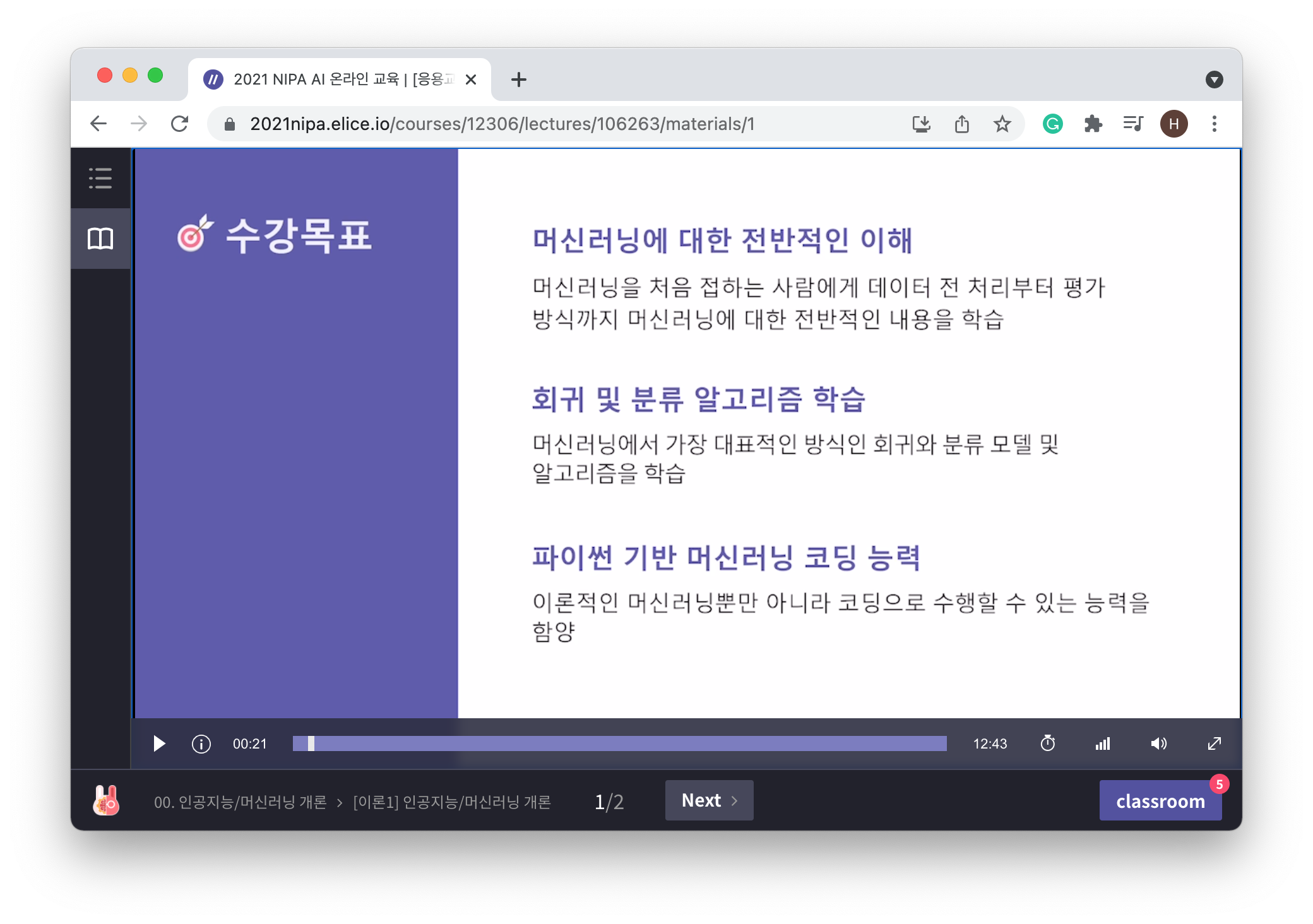그 중에서도 정보통신산업진흥원은 인공지능, 블록체인 등 ICT 역량을 가진 인재를 육성하기 위한 교육들을 진행해왔는데, 이번에 좀 더 입문자를 위한 과정이 열렸다. 이 "2021 AI 온라인 기본/실무 응용 교육과정"은 KAIST에서 만든 엘리스 코딩 플랫폼에서 진행되며 누구나 따라갈 수 있을 만큼 친절한 커리큘럼을 가지고 있다.