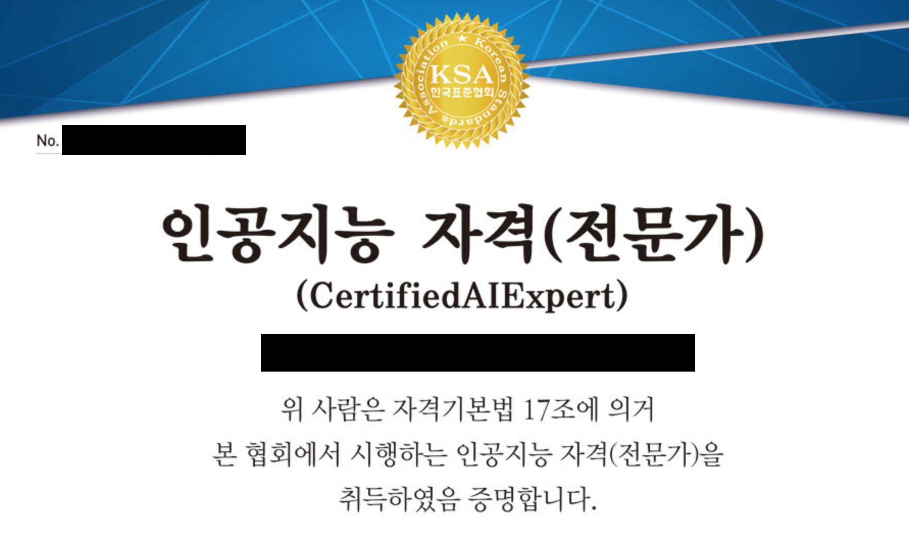 간단하게 수강 후기를 남기자면, 전반적으로 만족도가 높았지만 막바지에는 약간 아쉬웠던 교육 과정이라고 얘기할 수 있을 듯 하다. 사실 "[응용교육과정] 산업별 AI혁신 사례 살펴보기" 말고는 모든 과정이 하나 하나 다 도움이 되고 유익했다. 저 코스는 수료 조건에 필요해서 끝까지 다 듣긴 했지만, 실습내용이 너무 별로였다. 그냥 막판에 시간이 부족해서 구색 맞춤으로 넣은 것 같았다. 아쉬운 점만 계속 얘기하긴 했지만 아마도 다른 부분이 모두 훌륭해서, 실망감도 컸던 거라고 생각된다. 사실 누구 못지않게 열심히 충실히 과정을 따라 학습을 했고 그래서 결국 2021 AI 온라인 실무 응용 교육과정의 혜택 중 하나였던 인공지능 자격증 취득 지원을 받아 인공지능 자격(전문가)도 취득했으니 말이다. 쉽진 않았지만 보람이 있는 여정이었다.