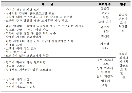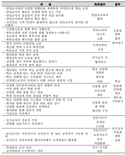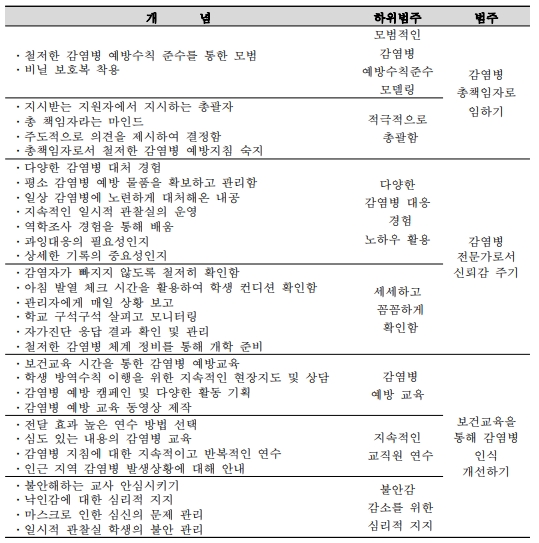 중심현상은 '외로운 고군분투’ 였고, 중재적 조건은 ‘업무 관련 네트워킹 활성화’, ‘학교 차원의 지원’으로 나타났다. 작용/상호작용전략은 ‘감염병 총책임자로 임하기’, ‘감염병 전문가로서 신뢰감 주기’, ‘보건교육을 통해 감염병 인식 개선하기’, ‘학교 맞춤형 감염병 대응 매뉴얼 구축하기’, ‘소통을 통해 협력 끌어내기’였다.