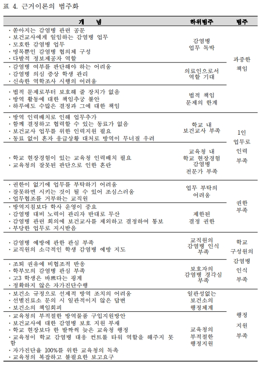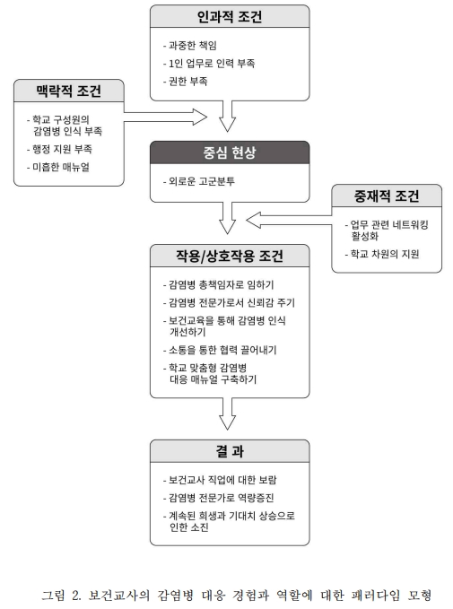 중심현상은 '외로운 고군분투’ 였고, 중재적 조건은 ‘업무 관련 네트워킹 활성화’, ‘학교 차원의 지원’으로 나타났다. 작용/상호작용전략은 ‘감염병 총책임자로 임하기’, ‘감염병 전문가로서 신뢰감 주기’, ‘보건교육을 통해 감염병 인식 개선하기’, ‘학교 맞춤형 감염병 대응 매뉴얼 구축하기’, ‘소통을 통해 협력 끌어내기’였다.