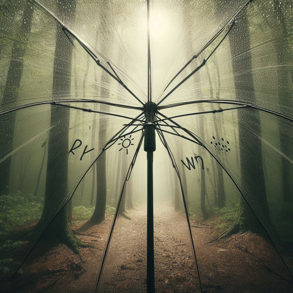 heavy rainy day, view from inside of umbrella, umbrella{transparent}, on the umbrella write the sunny, raindrops on umbrella only,  green forest background, wide shot